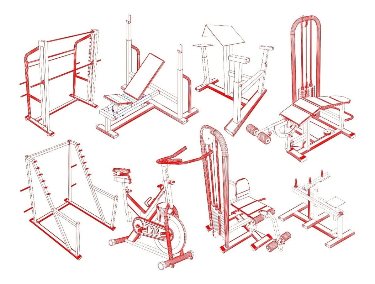 O pack contém 95 projetos variados, abrangendo máquinas profissionais e acessórios usados em academias comerciais e residenciais, incluindo: