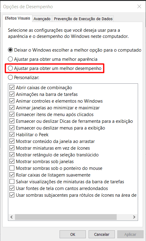 Selecione Ajustar para melhor desempenho