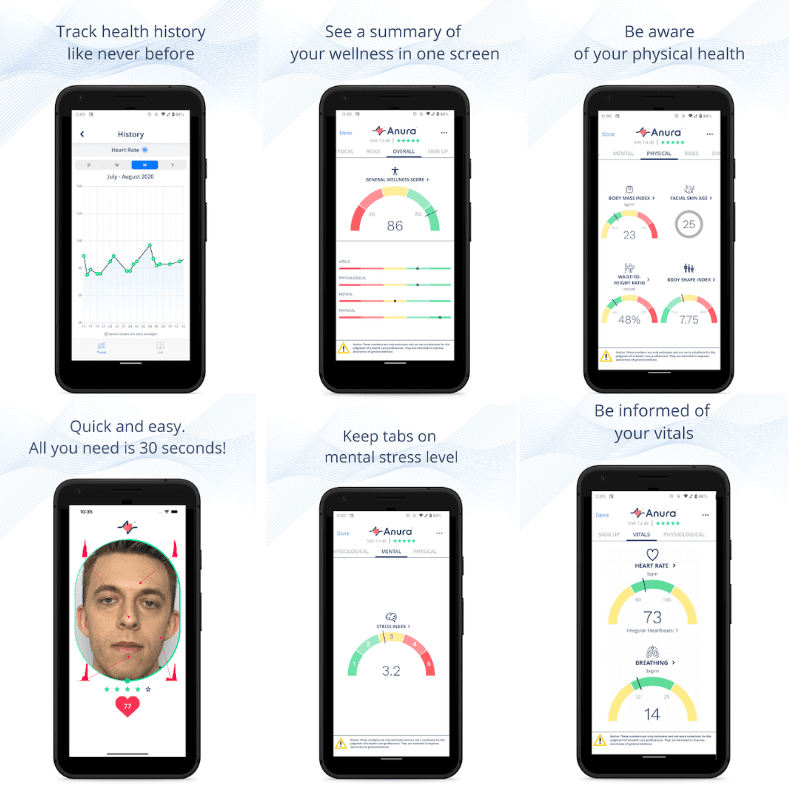 O Anura (ou Anura Lite, dependendo da versão) é um aplicativo de bem-estar que usa inteligência artificial para estimar indicadores fisiológicos e psicológicos a partir de um vídeo selfie de 30 segundos.